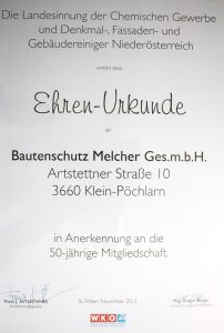 2013 Erhielt die BAUTENSCHUTZ MELCHER GmbH anlässlich ihres 50-jährigen Bestehens als Familienunternehmen die unten abgebildete Ehrung durch die Niederösterreichische Landesinnung.