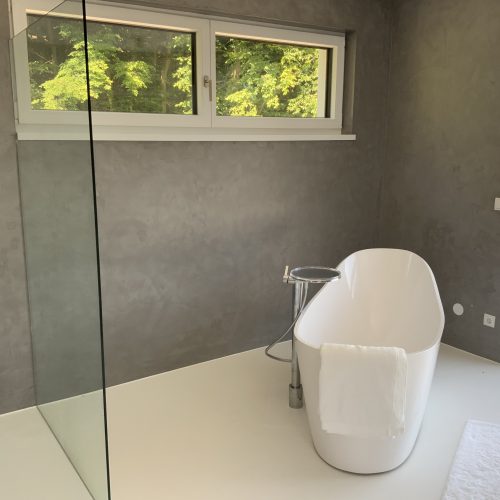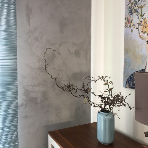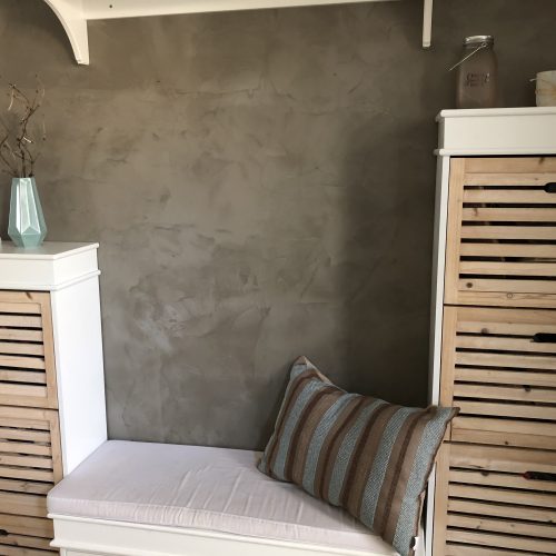 Bei dieser Beschichtungsvariante wird die Wand – unabhängig davon, ob es sich um einen neuen oder bestehenden Untergrund handelt – mit einer etwa 2 bis 3 mm starken zementären Schicht überzogen. Diese Schicht verdeckt den Untergrund vollständig und kann farblich sowie strukturell individuell gestaltet werden. Dadurch entstehen vielseitige Designoptionen, die von einem zart wolkigen Erscheinungsbild über schlierenartige Strukturen bis hin zu lebhaften Akzenten reichen. So wird jede Wandbeschichtung genau auf die Vorstellungen und Wünsche ihres Besitzers abgestimmt.
