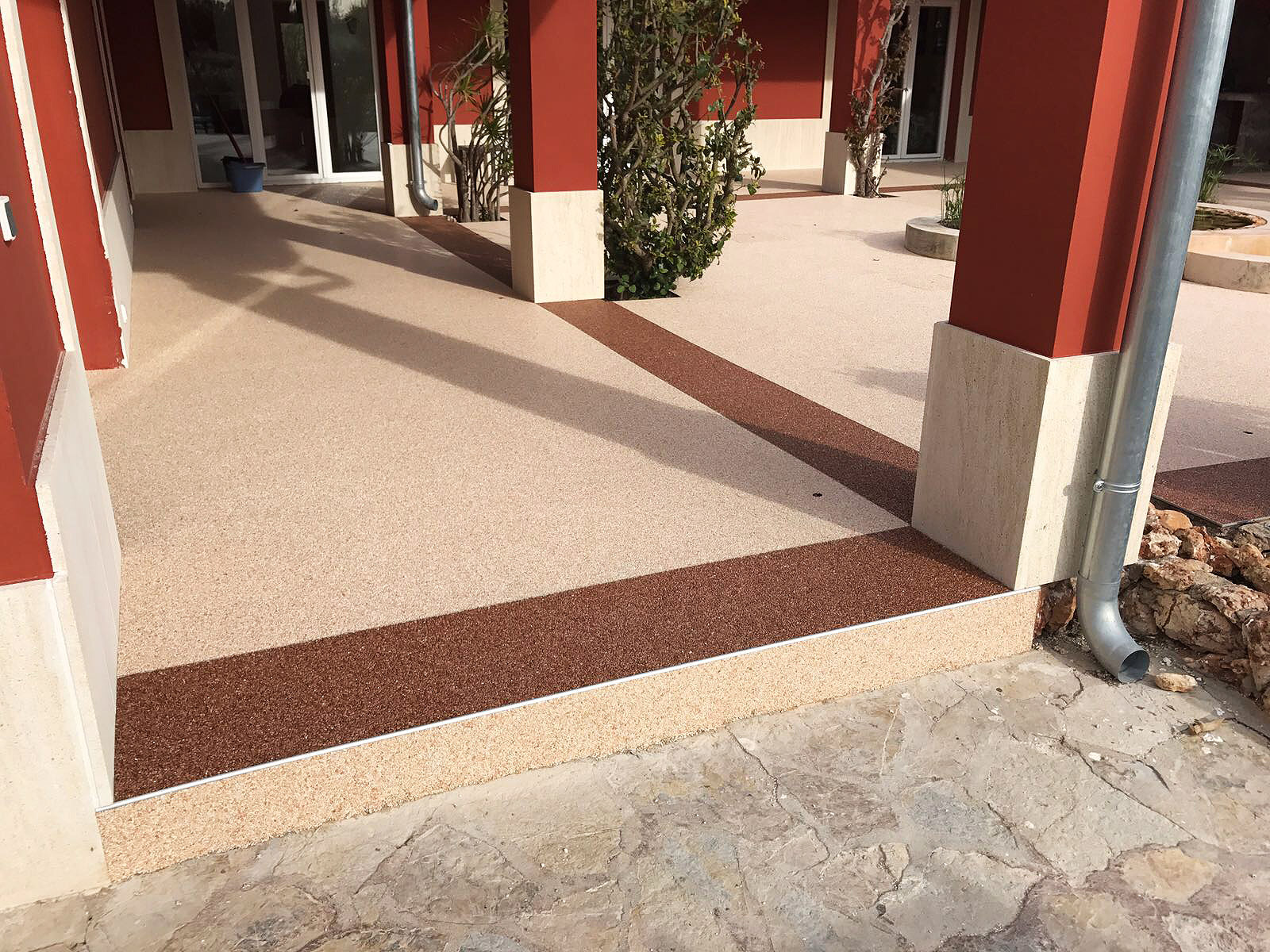 Ein Steinteppich ist nicht nur funktional, sondern bietet auch zahlreiche Designoptionen. Mit verschiedenen Farben und Körnungen des Marmorsteins können Sie Ihre Terrasse nach Ihren Wünschen gestalten. Mithilfe von Schienen oder Schablonen lassen sich individuelle Muster, Formen und Umrandungen umsetzen, die Bereiche optisch voneinander trennen und für ein einzigartiges Erscheinungsbild sorgen.